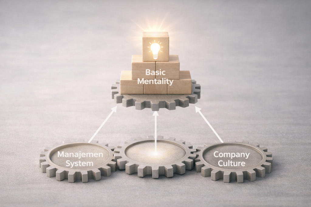Tanpa Basic Mentality, sistem manajemen cenderung menjadi administratif dan mekanis. Proses dijalankan karena kewajiban, bukan karena keyakinan. Sebaliknya, ketika Basic Mentality hidup, sistem manajemen berfungsi sebagai pengungkit: mempercepat, menstabilkan, dan menskalakan perilaku yang benar. Dalam konteks ini, sistem tidak menciptakan budaya; sistem hanya memperkuat budaya yang sudah ditopang oleh mentalitas dasar.