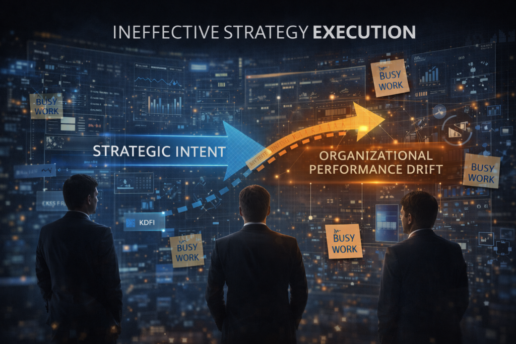Masalah utamanya bukan kurangnya aktivitas, melainkan ketiadaan sistem eksekusi dan pembelajaran. KPI tidak selaras dengan CKSF, struktur organisasi terfragmentasi, dan pengambilan keputusan tidak dirancang untuk belajar dari realitas. Akibatnya, organisasi tampak sibuk, tetapi bergerak menjauh dari niat strategisnya.