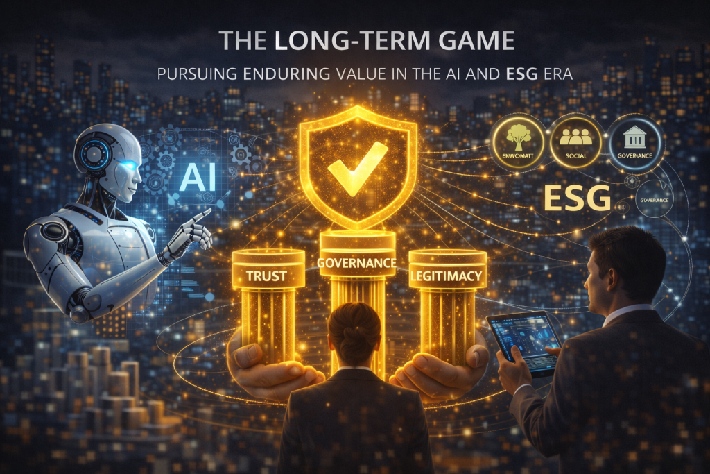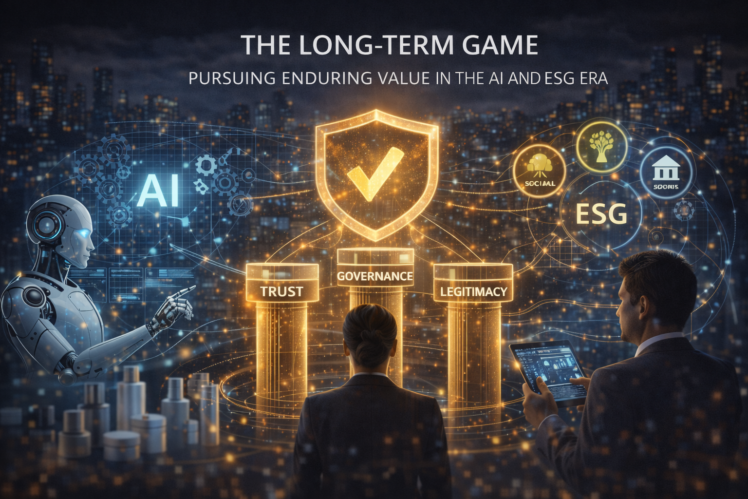 Artikel ketiga ini, The Long-Term Game, berfungsi sebagai penutup sekaligus puncak refleksi dari keseluruhan seri. Fokusnya bukan lagi pada bagaimana nilai diciptakan atau diperbesar, melainkan pada pertanyaan yang lebih mendasar dan sering dihindari dalam diskusi strategis: apa yang membuat nilai itu bertahan? Dalam konteks Artificial Intelligence (AI) yang berkembang eksponensial dan tuntutan Environmental, Social, and Governance (ESG) yang semakin mengikat, tesis utama artikel ini adalah bahwa nilai jangka panjang tidak ditentukan oleh kecepatan adopsi teknologi atau kepatuhan formal semata, melainkan oleh kualitas institusi yang menggunakannya—trust, tata kelola, dan legitimasi. Inilah fondasi yang membedakan pertumbuhan sementara dari ketahanan nilai yang berkelanjutan.